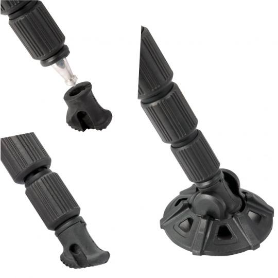 此外这款脚架支持独特的全地形三脚架脚垫,从防锈针型脚垫转变为倾斜的带纹理橡胶脚垫,以确保在不同地形上稳固放置和定位。