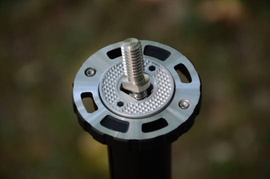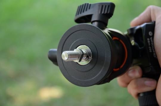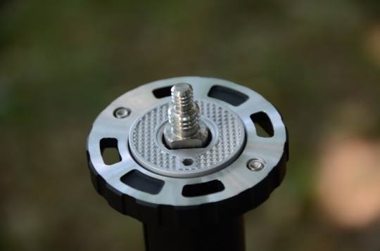 这款脚架还有几处创新设计,首先在脚架和云台衔接部分,转盘中央有1/4"转 3/8"的螺钉,可快速转换,以适应不同器材设备的安装。1/4"是比较常见的规格,而3/8"在中画幅、大画幅、以及专业摄像机上比较常见,该设计充分考虑了脚架应对重型器材的兼容性。