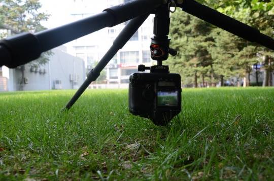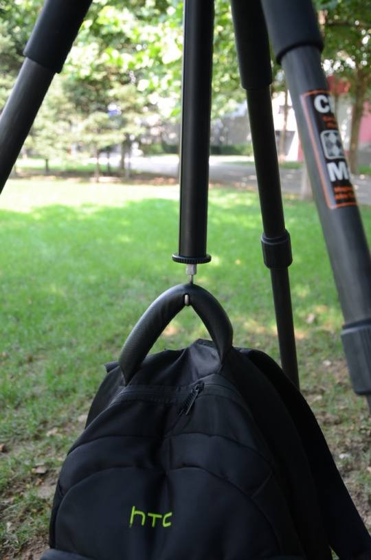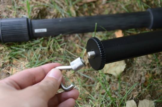 其次该脚架在中管尾部安装有挂钩,方便用户悬挂背包,当然可以将挂钩拧下,这样便可以安装云台。如此一来相机便可以安装在中管尾部,相机可以在很低的视角进行拍摄(贴近地面)。这样的设计可以让用户有更大的创作空间,超低角度拍摄成为可能。