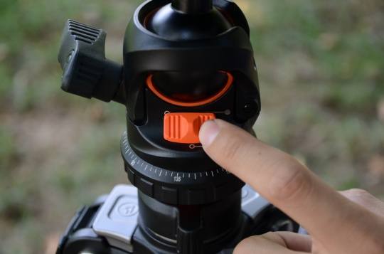该云台具备快速校平系统,不论相机的位置如何,该系统能够让您快速高效地调节相机,使其与云台底部齐平。我们可以看到在云台侧面有一个橘黄色按钮(中心定位按钮)便是起到该作用。将云台锁紧按钮拧松后,将橘黄色按钮推至左边,云台可以多角度调整,如果推至右边,云台可中心定位旋转。