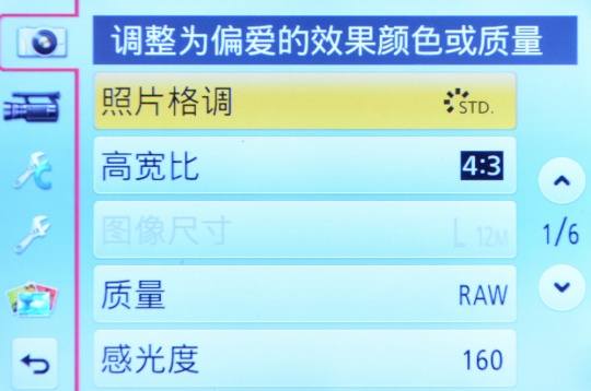拍摄菜单下调整常规选项。GF5可以拍摄RAW格式图像。
