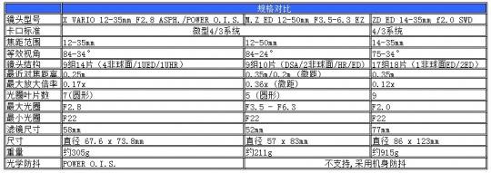 从规格对比来看,奥林巴斯的M.Z ED 12-50mm F3.5-6.3 EZ要逊色不少,松下这支标变镜皇与当年4/3系统的ZD ED 14-35mm f2.0 SWD神镜更为接近。当然由于恒定光圈要小一些、M4/3系统的原因(M4/3系统的法兰距离是4/3系统的约一半),这支H-HS12035要小巧很多。