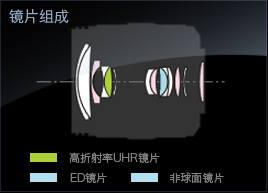 该镜头采用9组14片结构,其中1片UED超低色散镜片和1片UHR超低折射率镜片,以及4片非球面镜片,能有效进行球面相差和倍率色差的补正。镜头表面采用纳米表面镀膜技术减少了眩光和鬼影的发生。镜头12-35mm焦距等效135画幅视角为24-70mm,恒定F2.8大光圈,内置7片光圈叶片,最近对焦距离为0.25m,最大放大倍率为0.17倍。