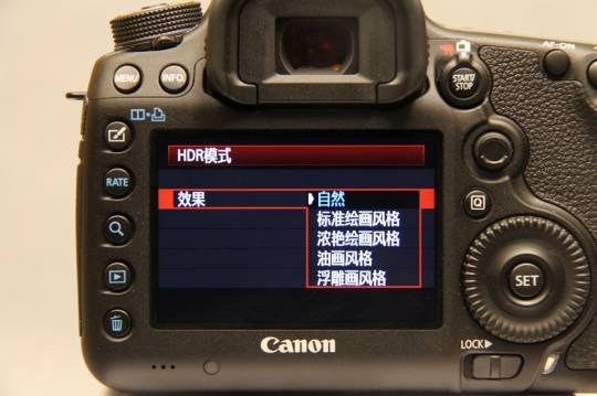 EOS 5D Mark III在该功能上做的非常细致!效果模式分五种:“自然”是能够在拍摄明暗差极大的场景时得到接近人眼所见自然效果的模式,可广泛应用于风光和夜景拍摄等。“标准绘画风格”比“自然”的效果更强,将暗处表现得更明亮。“浓艳绘画风格”的特点是表现插图一般的质感,用于明暗差大的夜景等拍摄时很有效。此外,“油画风格”进一步强化了色彩饱和度,因此适合拍摄画面内颜色多的场景等。“浮雕画风格”则能够得到被摄体轮廓发光的效果,拍出特点鲜明的图像。
