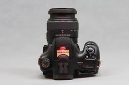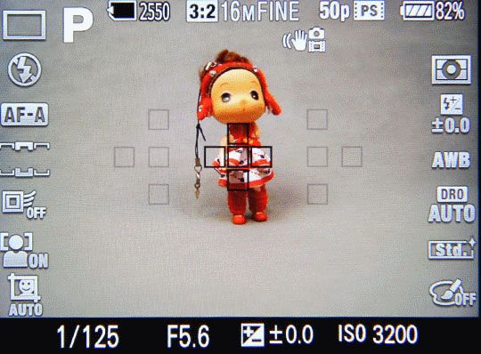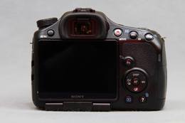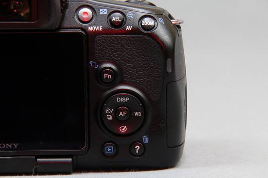 取景器左侧为MENU菜单按钮,大部分按键和拨杆都集中在右侧,分别是MOVIE(录像)、AEL/AV(AE锁定/光圈值)、ZOOM(放大/智能远摄转换)、Fn(功能),以及DISP(信息)、WB(白平衡)、连拍、照片效果组成的方向控制按钮,其中心是AF控制按钮(启动对象跟踪/焦点选择)。与索尼其他单电一样,Fn按钮起到重要作用,如拍摄模式、闪光模式、AF区域、测光模式、白平衡、照片效果等等都是通过按下它在屏幕/取景器上显示,用方向控制按钮进行选择。
