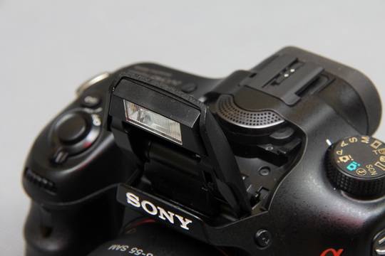 索尼α57的顶部,有内置闪光灯,这款内置闪光灯设计与索尼α77相同,内闪并非直接弹起,而是前移再弹起,这样设计不会与热靴上的设备冲突。在内闪后面是麦克风,再往后是索尼品牌专用的热靴接口,兼容索尼各种闪光灯设备,由于不是通用热靴设计使用普通热靴接口设备需要转接。