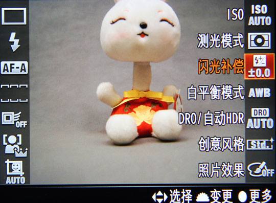 前文小编谈到Fn按钮起到重要作用,与α77、α65等单电相机相同,按下Fn按钮,在界面左右两侧显示很多图标,分别是场景选择、动态影像(短片拍摄模式)、拍摄模式、闪光模式、自动对焦模式、AF区域,对象跟踪、人脸检测/笑脸快门、自动肖像构图、ISO、测光模式、闪光补偿、白平衡、DRO/HDR、创意风格、照片效果。