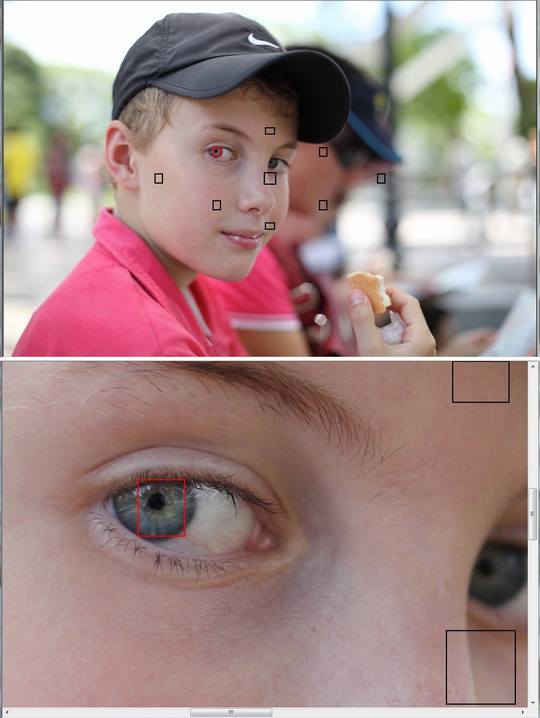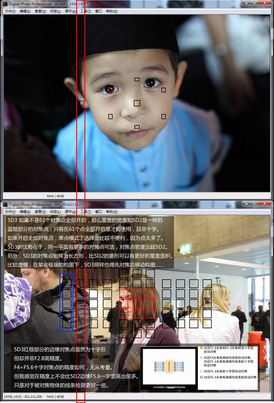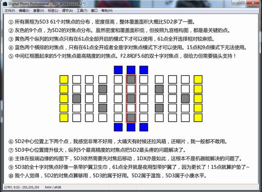 关于前文说的第9点,可能阐述的不是很明确,我在网上找了一张5D3的原始RAW文件,然后用自己一张5D2的RAW图片进行对比。两张图片均用DPP打开,显示对焦点,这样我们就可以比较轻易的比较这两个机器的对焦点覆盖的问题了。其实不管怎么对比,5D3相对5D2对焦的提升还是有的,只不过对于不同的人,可能需求也不尽相同。我尝试按照我的理解去简单的分析一下,说的不对的地方欢迎大家指正。