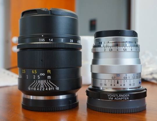 和ZM 35 2放在一起,即便是ZM 35加上转接环,都明显比35 0.95小一圈。