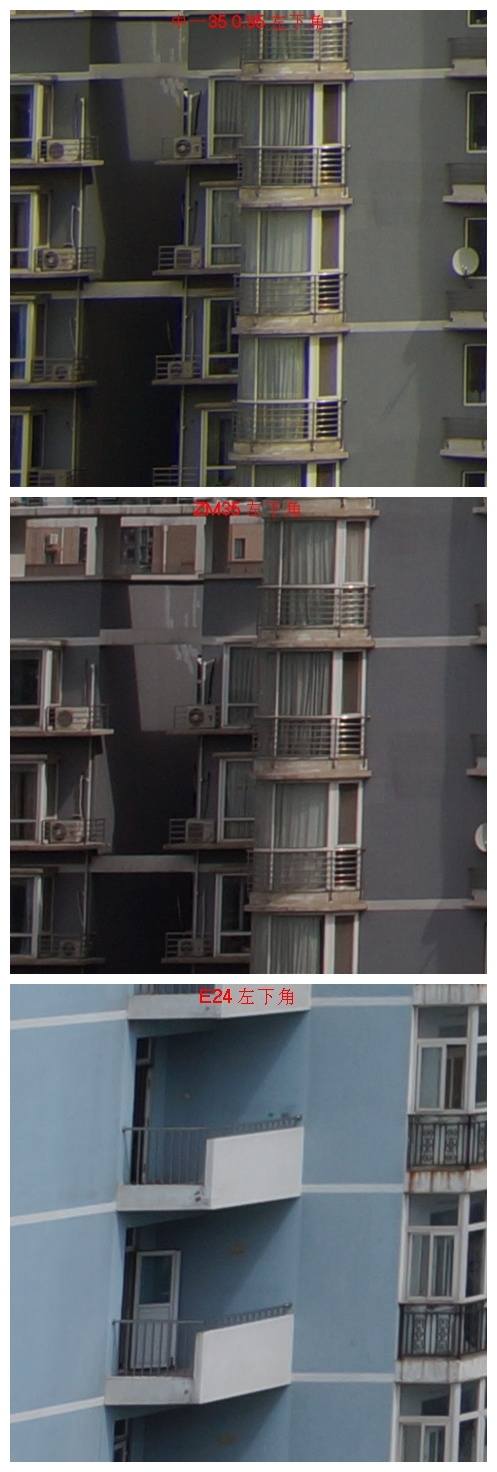 不难看出,这三个头在NEX 5N上的解像力都很高,彼此很接近。另外,也很容易看出E24的变形较大。