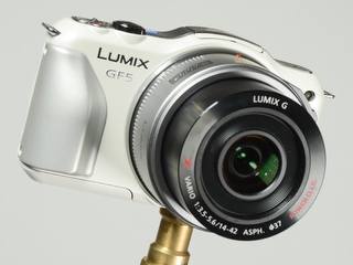 DMC-GF5的套机是一款可伸缩的饼干电动变焦镜头“LUMIX G X VARIO PZ 14-42/3.5-5.6 ASPH. POWER O.I.S.”,该镜头总长约26.8mm,采用电动沉胴式镜头结构,可与相机机身电源联动,开启相机电源后即开始待机状态,关闭相机电源后将以0.5秒的速度收起镜头,实现镜头的便携性与轻量化,表面采用纳米涂层,可有效减少眩光及鬼影的产生。