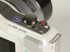 DMC-GF5机身顶部独立设置了智能iA键,只要下按键即可从其他拍摄模式进入智能iA模式中,当开启iA功能时,该键发出蓝色光芒。