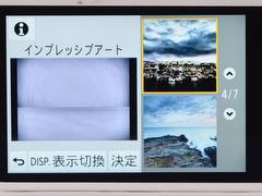 创意控制功能提供:富有表现力、乡愁怀旧、高基调、暗色调图像调节键、深棕色、动态单色、印象艺术、高动态、正片负冲、玩具相机效果、微型画效果、柔焦、星光滤镜和单点色彩,14种可选效果。设定效果后还可以对色彩鲜艳度、色调和对比度进行5阶段的调整。