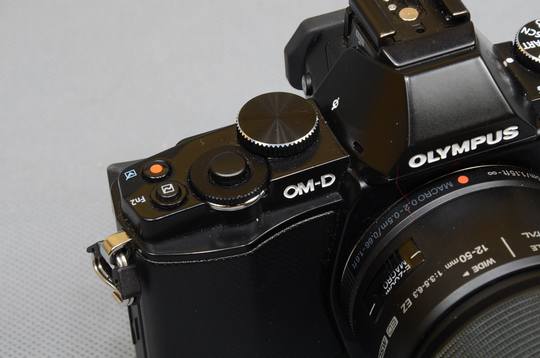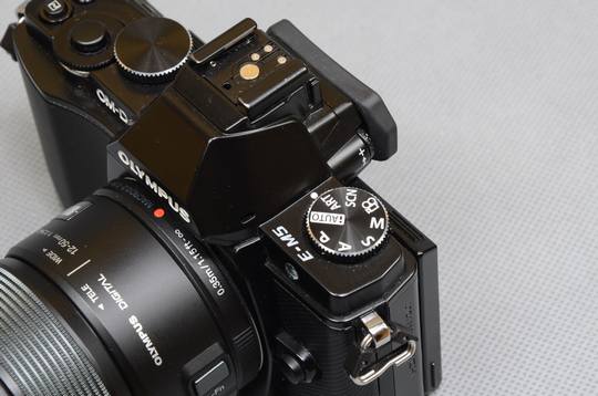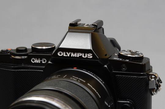 这款相机正面除了镜头释放按钮,几乎没有其他按键,标识仅有“OLYMPUS”和“OM-D”两处。并没有“E-M5”型号标识(该标识设计在左肩模式转盘前面)。