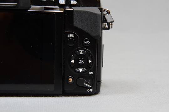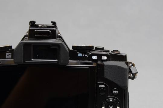 这款相机机身背面的按键中,开关以拨杆形式设计在右下角,与E系统单反上的设计类似。与E-P3设计相同有两个Fn按钮分别是在机顶Fn2和背面的Fn1。奥林巴斯E-M5机身上的按键都偏小且凸起很高。这样按下去键程偏长。小编猜测这样设计可能与防尘、防水溅有关。