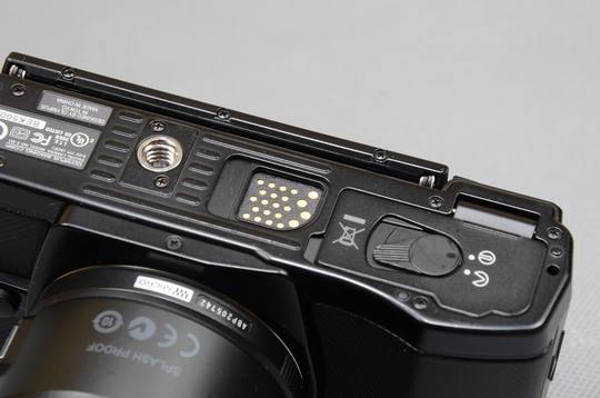 相机顶部配有热靴,热靴下方是配件端口。很多外置设备,如电子取景器、麦克风、通讯单元等除了连接热靴还要连接这个配件端口才可以使用。值得一提的是奥林巴斯这次类似索尼、三星,随机附赠小闪光灯(FL-LM2)。端口下面就是E-M5内置的电子取景器。该取景器与外置电子取景器VF-2一样,拥有144万像素、100%视野率、1.15倍放大倍率和18mm视点距离。