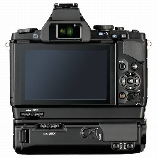 竖拍手柄除了快门还有2个fn键(B-Fn1、B-Fn2)、拨盘和LOCK功能锁定拨杆(锁定快门/按键等功能)。竖拍手柄还是电池仓(可放BLN-1一节)。奥林巴斯OM-D E-M5当初谍照泄露,很多网友惊呼个头太大了,其实这是一种误解,那是该机加装双层手柄后的效果,事实上机身本身体积并不大。