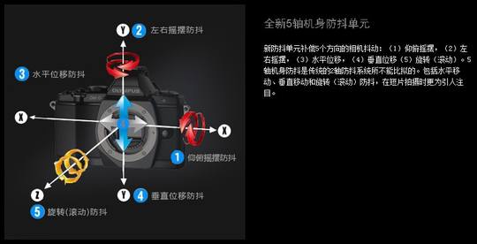 大多数防抖系统是2轴防抖,而本文中E-M5采用了5轴机身防抖技术。除了普通的2个方向(仰俯摇摆&左右摇摆)上的防抖,还提供了垂直位移、水平位移和旋转(滚动)防抖,弥补了在微距摄影中容易出现的抖动。位于相机顶部的传感器即时检测相机抖动,配合新开发的5轴图像稳定装置提供防抖补偿。此外,新的防抖控制也能进行低频防抖,例如,长时间手持相机、步行拍摄短片时造成的抖动等。由于防抖系统是机身防抖,对于搭配在机身上的任何镜头都适用。另外通过电子取景器能够看到防抖效果(过去的机身防抖系统不能修正取景器内图像的抖动)。