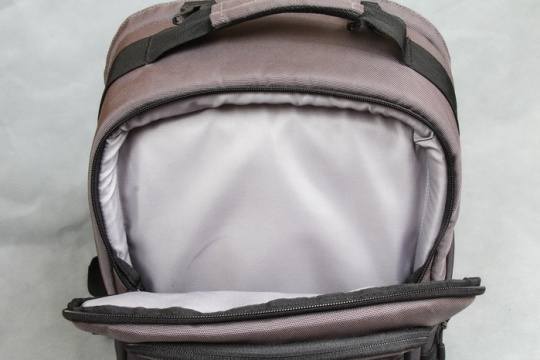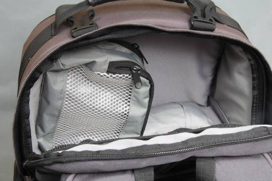 Reebok 200N有两个主要存放相机的部分,这里是偏上的一个部分,这里可以放下一整部带镜头的相机,并且一些小物件如存储卡可防雨罩都可放在这个地方。