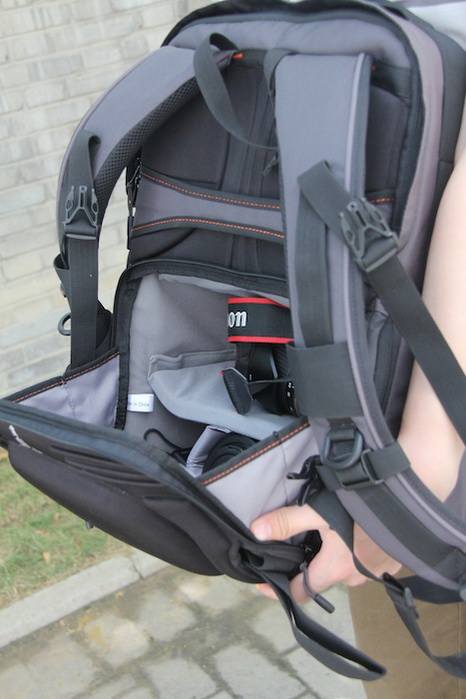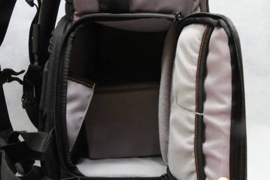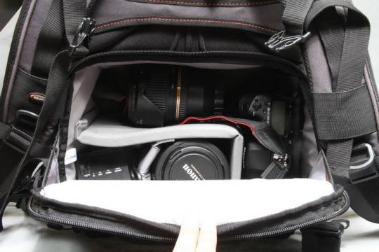 在底部的主要存放器材的隔舱里,你可以放一机两镜,并且可以从侧面打开快速取出相机