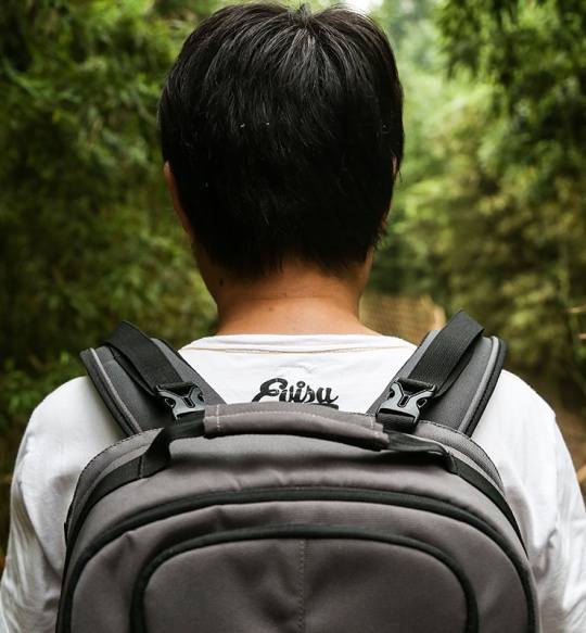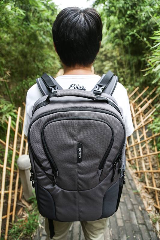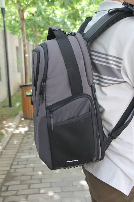Reebok 200N的背负效果实拍,可以看到这款摄影包还是比较大的,毕竟有两个主要的存放器材的部分。拉链设计在身后可以有效防止小偷。