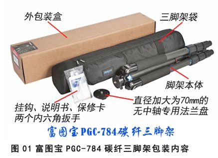 富图宝PGC-784碳纤脚架的包装中规中矩,大小和一般常用管径28mm标准脚架的尺寸基本相同,除了附送的三脚架袋和说明书、保修卡、内六角扳手之外,还有一个硕大的挂钩和一个拆除中轴后专用的直径70mm法兰盘(见图1)