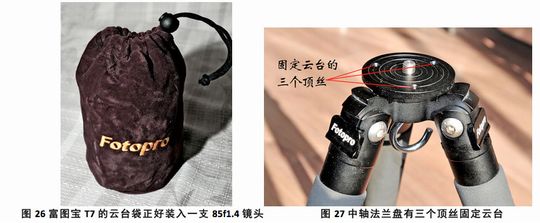 在安装到脚架之后,T7云台所附的绒布袋就失去了“职业”。我发现可当镜头袋使用,最大正好可以装入AF85/1.4D的镜头。