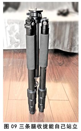 而后要做一个最简单也是最重要的试验:脚架三条腿收拢以后,自己能很容易稳稳地站住,见图9。这一项若通不过,那此项就没有“星”,作为“一票否决”项,后边也就不用再查了(袖珍式的脚架由于末节直径过细,脚垫面积过小,不能要求“像锥子一样”还能立住,因此允许三条腿稍微对称离远一点,但不能远于和地面垂直的距离)。