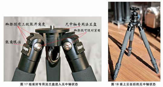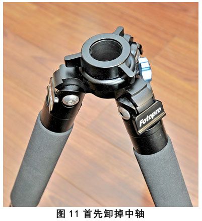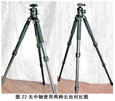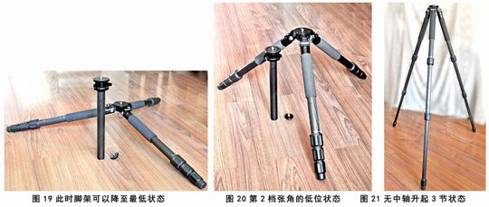 移除中轴以后,三脚架就可以降到距地面14.7cm的最低位,在第2档张角下的高度是37.2cm(图19、20、21)。
