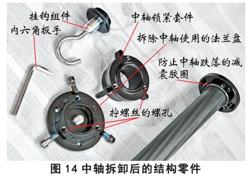 ⑶ 从图14可以看到,中轴拆卸后的零部件包括:中轴(注意顶板下方的减震橡胶圈)、挂钩、三角螺旋锁套、直径70mm的专用加大法兰盘(背面和螺旋锁套同样的位置也有3个同样的螺纹孔)。