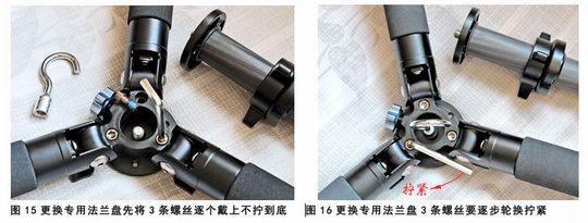 ⑷ 返回正面,用专用法兰盘取代三角螺旋锁套的位置;再翻回反面,重新把3条内六角螺丝带上。注意由于三条腿不能完全放平,六角螺栓扳手旋转角度受很大限制。可以先将内六角扳手竖起使用,将3条螺丝逐个戴到位但不拧到底,然后再横过内六角扳手使用,这样便于发力上紧螺丝。