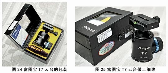 富图宝PGC-784三脚架的云台套装是富图宝T7云台。该款云台最明显的特征就是“小蛮腰”,这个独出心裁的设计除了美感之外,最大的好处就是:获得了与球台主体几乎相同的底座直径。这对反折三脚架的收拢体积特别有利。它的阻尼调整也很有特色,在主锁紧钮的内侧安装的阻尼调整环。这实际上就是一个主锁紧钮的螺旋限位,在主锁紧钮退到合适的阻尼力位置时,拧紧调整环,以后主锁紧钮就只能松开到这个位置为止。此外精致的包装和细腻的做工也很引人注目(图24、25)