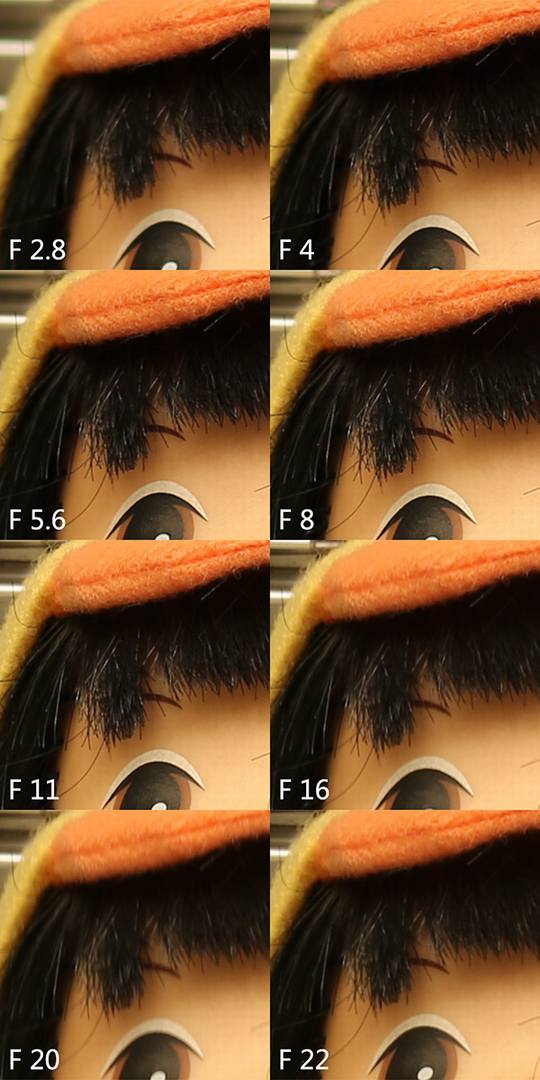 接下来的环节我们看一下这只镜头在120端和300端各档光圈下的锐度情况,拍摄使用5D Mark III中心点对焦,感光度100,画质为标准,100%中心截图。主要观察发丝的变化情况。