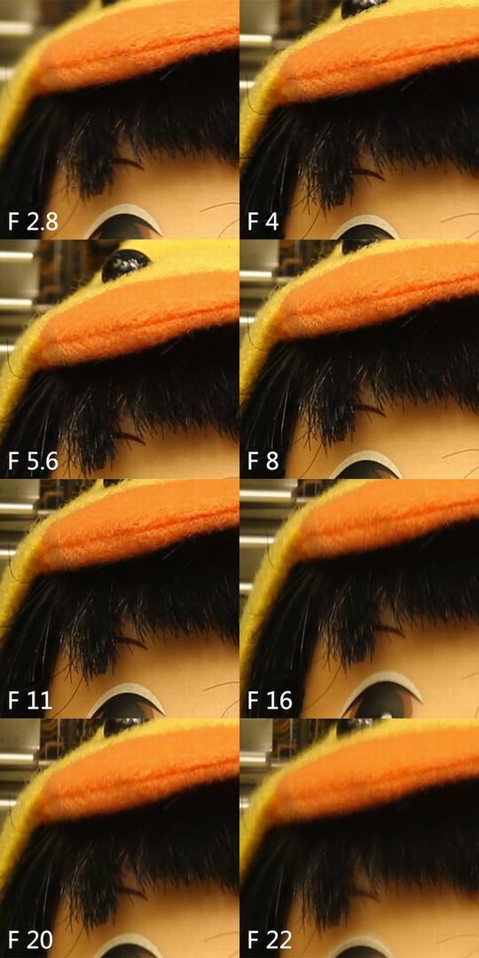上图看出在300mm端最大光圈F2.8仍然锐度不高,从F4后明显改观,F8时达到最佳,一直到F16发丝都清晰锐利,F20后下降厉害,但是300mm端F16的光圈用到的时候就很少了,建议大家在有三脚架的时候尽量缩小一档光圈使用为宜。