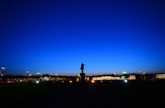 圣彼得堡,彼得大帝,面向太阳落下的方向拍摄这张照片时,当地时间晚上12点整,天空微蓝色在PS里调整了一下水平线,拍摄数据是1/60,F2.8,ISO1000,-2/3EV
