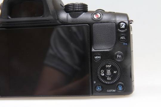 屏幕右侧的操作不多,包括MENU按键、Fn(多功能按键)、回放按键、删除按键、速控转盘和转盘以内的自拍/连拍、DISP、ISO、AF和中间的OK按键,在大拇指的右边是曝光补偿按键和AEL按键,还可以看到最上面的红色视频录制按键。