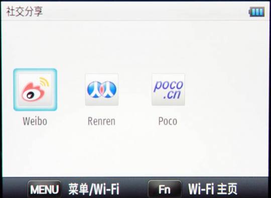 点进去社交分享,会看到NX20内置了三个分享客户端:新浪微博、人人网和POCO。