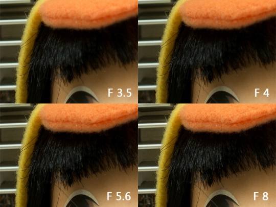 小编分别用18mm广角端和55mm长焦端拍摄了各档光圈下的头发丝图像,从头发丝的变化我们可以看到那个光圈下表现较为锐利。