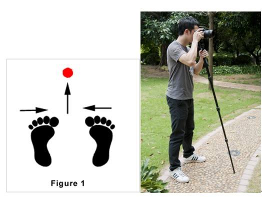 方法一(如下图):左脚和右脚平行或双脚稍微张开约10度角。根据三根腿的长度,独脚架放置大约在拍摄者双腿前2英寸,近似20度角。使用的独脚架云台使相机能在水平和垂直方向定位。让相机尽可能靠近使用者的胸膛,同时弯曲两个肘尽可能靠近你的体侧。左手紧握独脚架的顶端和相机底端,向地面适当用力下压独脚架,稳定独脚架。