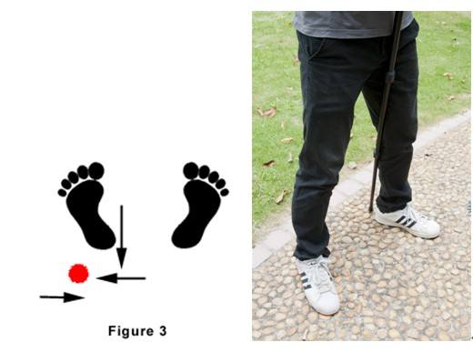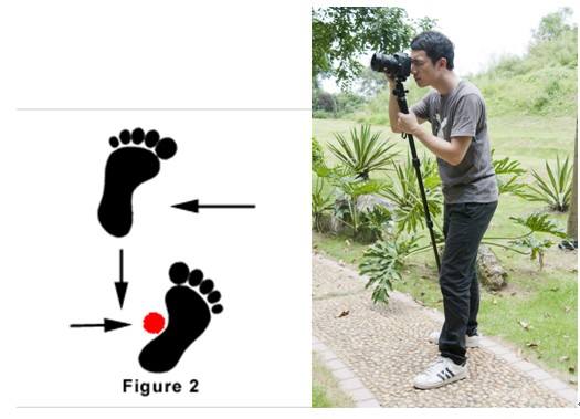 方法二(如下图):左脚朝前,右脚在后,红色的圆形符号是独脚架的底端。这是一个很稳定的姿势。左脚不是朝向正前方而是朝内偏转大约10度角,右脚几乎和左脚平行。要点是拍摄者的身体完全稳定不会前后从一边倒另一边倾斜,左腿少许弯曲。放置独脚架靠到右脚的内侧,阻止独脚架向右方或者向后移动。稍许弯曲左腿把独脚架靠到左边腿上。这样独脚架对身体保持20度角并稍许超前倾斜。左手握住独脚架的顶端和相机底端,适当用力朝地面下压架身并稍许左倾。独脚架向左腿的压力会阻止它向左边移动。这将稳定独脚架,以致腿不会在地面滑动和向前移动。这种方式独脚架现处于非常稳定的状态,横拍和竖拍都可以。