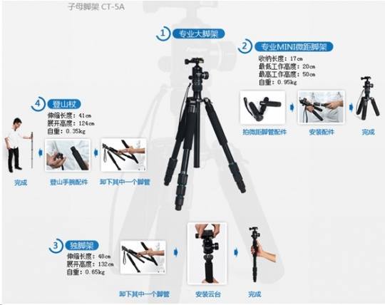尽管独脚使用方便,优点突出,但对一般玩家来说,独脚架应用面依然不广,仅为抓拍托举哥而单买一支独脚架性价比显然不高。所以多用途三角架倍受摄友青睐,如最近小编发现一款富图宝的四合一子母脚架。外表看似是一个常规的三脚架,其实可以根据拍摄需求,快速变换成专业大脚架、独脚架、专业微距脚架、登山杖,使用方便。