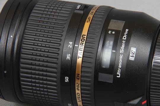 金圈下面紧挨着便是对焦环,从实际使用来看腾龙这款镜头变焦环和对焦环都有些发涩,手感中规中矩。对焦环下面是距离窗,这支镜头的最近对焦距离为0.38m 。而在距离窗下面我们可以看到“Ultrasonic Silent Drive”(超声波静音马达)与“VC”(防抖补偿)的白色字样。