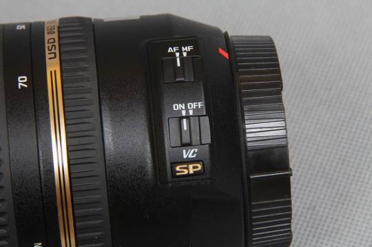 镜头右侧有两个开关,分别是AF/MF切换和VC防抖开关。开关下面有“SP”字样。SP 指Super Performance 镜头系列,代表出色的表现和更高的性能,也就是说SP系列是腾龙镜头的高端系列。