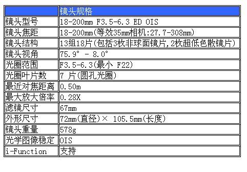 下面我们先来看看18-200mm F3.5-6.3 ED OIS的参数规格
