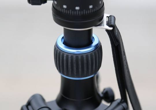接下来是脚架的细节,此纽为中轴锁紧旋钮,我们发现旋钮下方的部分是以上小下大的圆柱形设计,这样可以让稳定性进一步加强,增大承重力,类似于富图宝小蛮腰云台设计理念。