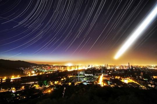 地球自传24小时,每颗星星会画一个圆圈。你看它们变成圆形的了,但它们并没有画成一个圈啊,他们只是因为地球的自转产生移动了,而星星众多,所以你看起来他们就是围绕着圆心旋转了。举个例子,这张照片我曝光了四个小时,你可以看到,每颗星星绕着它所在的同心圆移动了六分之一圈,因为四小时占全天时间的六分之一。