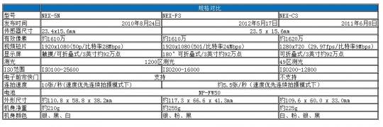 索尼微单的每次更新都会出现5系列老产品与3系列新产品同价位竞争的局面,上代我们纠结于NEX-5C与NEX-C3,现在我们又要纠结于NEX-F3与NEX-5N,我们可以将“3”系列两代产品与NEX-5N进行规格上的对比: