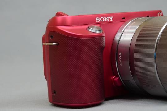 NEX-F3在机身细节设计方面大致与NEX-C3不同,正如前文介绍NEX-F3身上有很多NEX-7的影子。比较明显的特点就是手柄部分,NEX-F3的手柄与NEX-7类似比较突出,这使得快门按钮可以放到手柄上端,与电源开关拨杆分开。这样的设计我们在NEX-5N身上也见到过。
