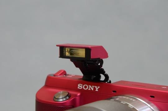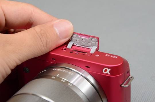 NEX-F3在相机顶部增加了内置闪光灯,方便用户在暗光下补光拍摄。目前NEX系列中除了NEX-F3仅有NEX-7支持内置闪光灯。此外相机的顶部还有索尼NEX系列专用附件插口用来接外置闪光灯、外置光学取景器FDA-SV1、外置XGA OLED电子取景器FDA-EV1F等附件(该外置电子取景器与NEX-5N的FDA-EV1S型号不同)。