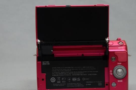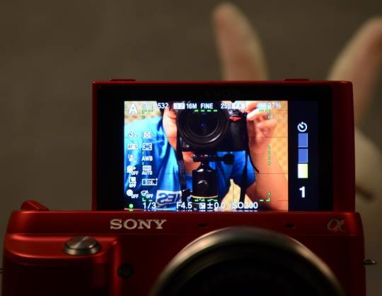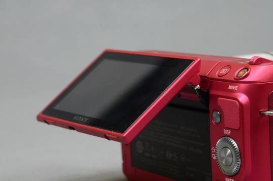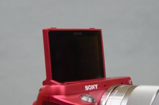 NEX-F3与其他NEX产品最大的不同就是其折叠屏可以向上从原来的80-90度加大到180度。这样屏幕可以冲向前方,用户可以看着屏幕对着取景,类似的设计曾在自拍DC 三星MV800上出现过。索尼还设计当翻起液晶屏时,可设置自动进入定时(3秒)自拍模式。